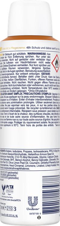Dove Vanilla Scent anti-perspirant deodorantspray kombinerer langvarig beskyttelse med en behagelig sød vaniljeduft, der styrker sanserne og giver en behagelig følelse. Med op til 48 timers beskyttelse mod fugt under armene og uønsket kropslugt er den den ideelle ledsager i hverdagen. Den alkoholfrie formel er særlig skånsom mod huden og indeholder ¼ plejende creme, der holder huden under armene blød og smidig. For at opnå det bedste resultat skal deosprayen bruges på tør, afkølet hud. Sprayen er certificeret af PETA og lever op til veganske standarder, da Dove ikke tester på dyr i hele verden. Oplev den perfekte beskyttelse og pleje af din hud med Dove.