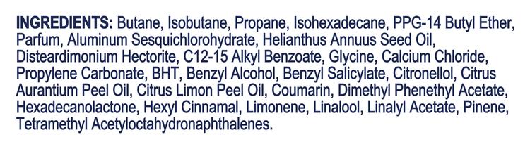 BUTANE, ISOBUTANE, PROPANE, ALUMINUM CHLOROHYDRATE, PPG-14 BUTYL ETHER, CYCLOPENTASILOXANE, PARFUM, DISTEARDIMONIUM HECTORITE, HELIANTHUS ANNUUS SEED OIL, C12-15 ALKYL BENZOATE, BHT, OCTYLDODECANOL, DIMETHICONOL, PROPYLENE CARBONATE, BENZYL ALCOHOL, CITRONELLOL, COUMARIN, LIMONENE, LINALOOL.