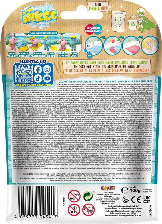 Craze Inkee Fun Beach-badebomben giver en sprudlende badeoplevelse og glæder med en forførende vandmelonduft. Denne unikke badebombe opløses sprudlende i vandet og udsender en sød, forfriskende duft, der gør badet til en afslappende oplevelse. Et ekstra højdepunkt er den medfølgende overraskelse: Når du bruger den, kan du opdage en af i alt 6 forskellige figurer, som gør det endnu sjovere at samle på den. Badebolden er testet af TÜV Rheinland og har fået bedømmelsen "meget god" af Dermatest. Den er fri for mikroplast og vandopløselige, rent syntetiske polymerer, hvilket gør den sikker at bruge. Den giver heller ikke pletter på hud, hår eller i badet.