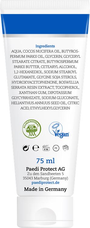 Paediprotect Baby Care Cream Intensive er den ideelle løsning til særlig tør og ru hud. Med en rig formel, der indeholder sheasmør og kokosolie, giver den din babys følsomme hud intensiv fugt og sikrer en smidig hud. Lakridsrodsekstraktet virker beroligende og understøtter hudens beskyttende barriere, og cremen efterlader ikke en fedtet film. Denne alsidige hudplejecreme er naturligt vegansk, parfumefri og indeholder ikke mikroplast. Perfekt til skånsom pleje af følsom hud.