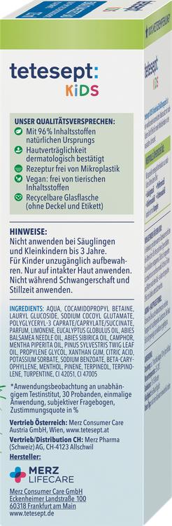 Tetesept KIDS Children's Bath Cold Time er specielt udviklet til børns behov i den kolde og våde årstid. Dette beroligende badetilsætningsstof kombinerer værdifulde naturlige æteriske olier, herunder eukalyptusolie, pebermynteolie, fyrrenåleolie og grannåleolie, med kamfer for at udfolde de positive egenskaber i det varme badevand. Den milde og hudvenlige formel sikrer, at dit barn kan slappe af, føler sig dejligt varm og har det helt behageligt. Ideel til en allround følelse af velvære, der understøtter trivsel og kan fremme blodcirkulationen.