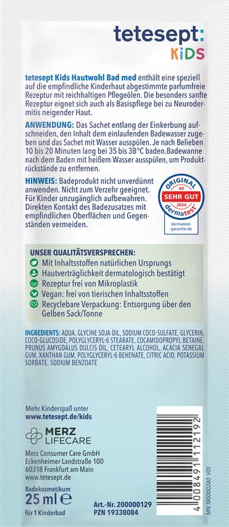 Tetesept Kids Hautwohl Bad Med er specielt udviklet til behovene hos følsom børnehud. Den parfumefri formel med værdifulde nærende olier giver en skånsom rensning og er ideel til børn fra etårsalderen. Badetilskuddet er særligt velegnet til tør hud og hud med tendens til neurodermatitis og giver en afslappende og beroligende badeoplevelse, der plejer og beskytter huden. Den milde formel styrker hudbarrieren og giver børn mulighed for at slappe af i et beroligende bad.