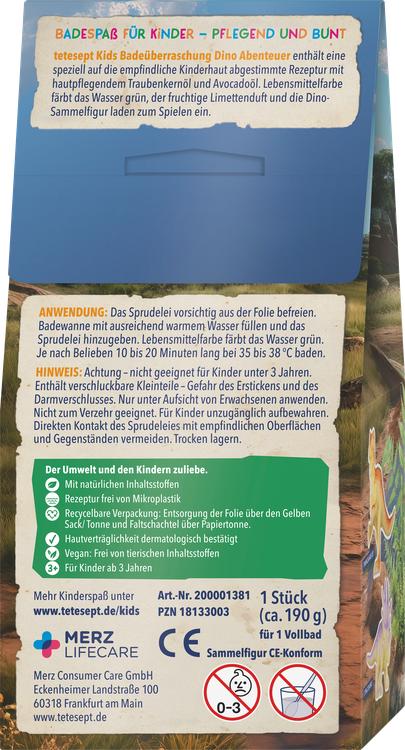 Oplev en sprudlende badeoplevelse for børn med Tetesept Kids Bath Surprise Dino Adventure! Denne formel, der er specielt udviklet til børns følsomme hud, kombinerer hudplejende vindruekerneolie og avocadoolie for blidt at forkæle huden. Den frugtagtige limeduft sikrer en forfriskende badeoplevelse, mens levnedsmiddelfarven får vandet til at gløde i en spændende grøn farve. Et særligt højdepunkt er dinosaurfiguren, som indbyder til leg og samling. Denne badezusætning er egnet til børn fra tre år og dermatologisk testet og er det perfekte valg til et sikkert og underholdende badeeventyr.