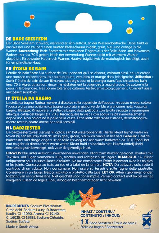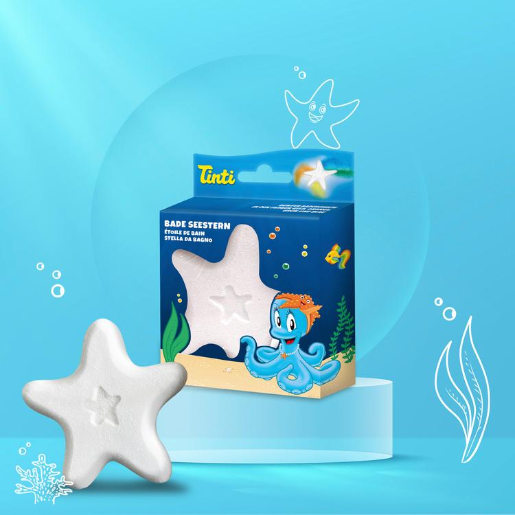 Tinti-børnenes badetilsætning badestjerne forvandler badning til en farverig oplevelse! Når søstjernen lægges i badekarret, flyder den charmerende på vandoverfladen og begynder at opløses. I mellemtiden udfolder den sine magiske farver og fremtryller et imponerende tæppe af lysegrøn, orange, gul og turkis. Den søde jordbærduft giver en ekstra god oplevelse, som vil glæde børn. Når badet er slut, skinner vandet i en vidunderlig grøn nuance, mens huden og badet ikke er misfarvet. En ideel badeoplevelse for små opdagelsesrejsende!