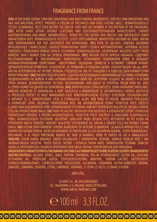 Oplev en duftrejse med LA RIVE Cabana Man After Shave, som beriger din hverdag med et strejf af eksotisme og eventyr. Sammensætningen af orientalske noter udfolder sig med en forfriskende topnote af kanel og kardemomme, som straks stimulerer sanserne. De sensuelle aromaer af nellike, lavendel og eukalyptus mødes i hjertet og udtrykker en følelse af frihed og stil. Basenoten af vanilje og hvid mos giver en harmonisk finish og efterlader en forførende, langvarig duft på din hud. Denne aftershave er ideel til mænd, der nyder livet i alle dets facetter og kan lide at tage nye udfordringer op. Lad CABANA inspirere dig, og opdag de spændende muligheder, som hver dag byder på.