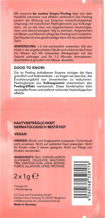 be routine enzyme peeling powder giver en særlig skånsom og effektiv rensning af huden. Med enzymer af bioteknologisk oprindelse og naturlige eksfolierende stoffer fremstillet af vulkansk sten fjerner den døde hudceller og overskydende talg. Understøttet af salicylsyre efterlader peelingen huden opfrisket, smidig og glat. Betain og allantoin fremmer også hudplejen og efterlader en blød hudeffekt. Produktet er pakket i en praktisk 2-kammerpose og er ideel til pålidelig anvendelse. Ideel til alle hudtyper, der ønsker en skånsom, men grundig rensning.