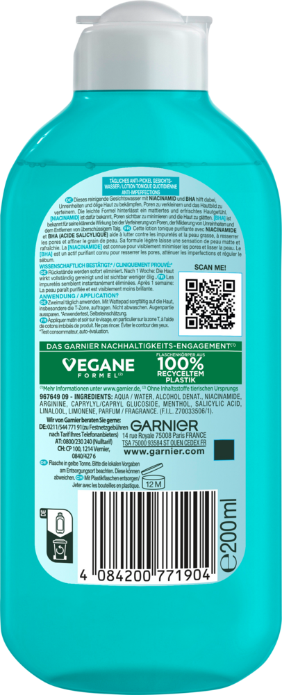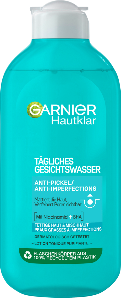 Garnier Hautklar ansigtstonic renser og klarer huden med salicylsyre og zink. Det bekæmper urenheder og regulerer talgproduktionen, mens porerne synligt forfines. Anti-glanz-effekten sikrer et mat hudbillede.