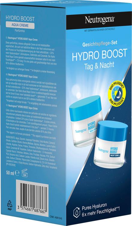 Neutrogenas Hydro Boost-ansigtsplejesæt giver dig optimal pleje til dag og nat. Den parfumefri dagcreme med innovativt hyalurongelkompleks og 100 % plantebaseret trehalose sikrer øjeblikkelig og langvarig fugtning af huden. Den hjælper med at styrke hudens beskyttelsesbarriere og beskytter mod ydre påvirkninger, der kan føre til tørhed og en ru teint. Natcremen er på den anden side beriget med hyaluronsyre og understøtter hudens regenerering natten over. Dens selvudglattende memory gel-formel reducerer træthedstegn og sikrer en smidig, blød og sundt udseende hud. Med dette sæt får du den perfekte duo til hydreret og strålende hud - dag efter dag og nat efter nat.