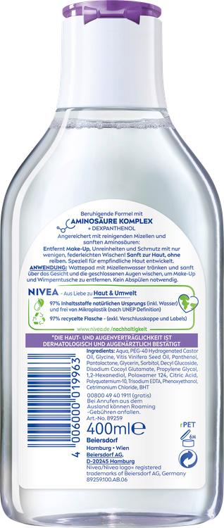NIVEA Soothing Micellar Water er den ideelle løsning til følsomme hudtyper, der har brug for skånsom og effektiv rensning. Denne innovative formel fjerner grundigt makeup, herunder genstridig mascara, og renser skånsomt huden uden at irritere den. Beriget med dexpanthenol og vindruekerneolie sikrer den ikke kun en grundig rensning, men beroliger også huden og plejer det følsomme øjenområde. Micellerne tiltrækker urenheder som en magnet og giver huden mulighed for bedre at absorbere ilt. Med blot et par aftørringer efterlader det micellære vand huden opfrisket og ren uden at efterlade rester. Den miljøvenlige emballage er fremstillet af 95 % genbrugsmateriale, hvilket understreger NIVEAs bæredygtige filosofi. Denne micellære vand er dermatologisk og oftalmologisk testet og er et pålideligt valg til daglig hudpleje.