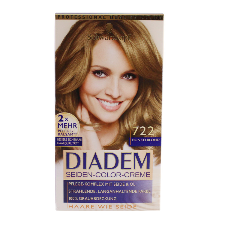 Diadem Color-Creme Mørkeblond 722 med flydende silke og værdifuld olie beskytter håret allerede under farvningen. Plejer dybt, så håret optager farven optimalt, pigmenterne trænger dybt ind i hårfibre og udnytter dermed deres fulde intensitet. For strålende, langtidsholdbare farver og 100% grå dækning.
