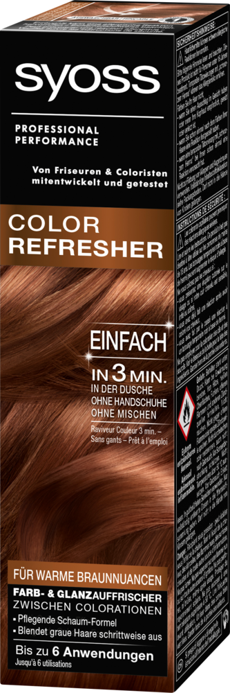 Farve- og glansforfrisker mellem to farvninger: Syoss Color Refresher mousse til varme bruntoner sikrer øjeblikkelig farveintensitet og et salonsfrisk look. Hjælper med at dække grå rødder og tilpasse farverne.