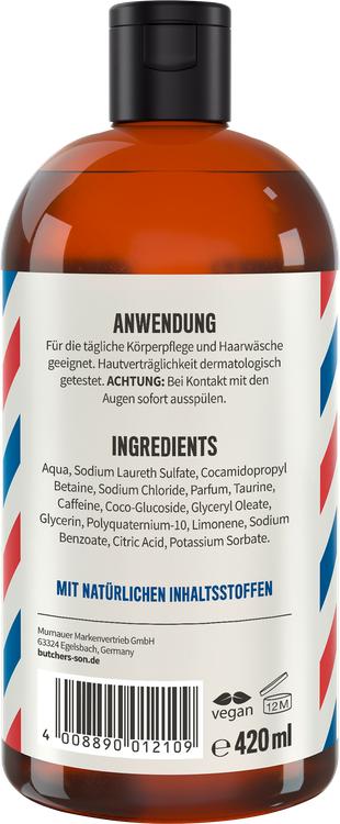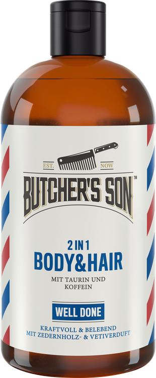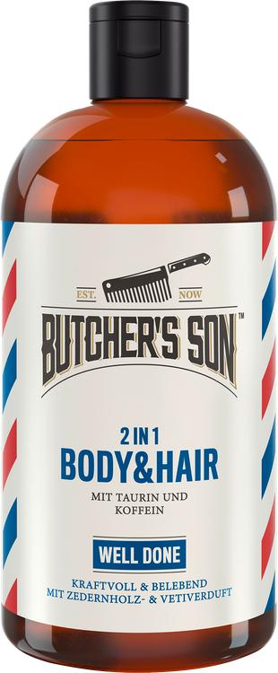 The Butcher's Son 2in1 Body & Hair Shower 'Well Done' kombinerer pleje og duft i ét unikt produkt. Denne alsidige bruser er ideel til den moderne gentleman og giver ikke kun en forfriskende rensning af krop og hår, men er også opkvikkende og revitaliserende. Den innovative formel indeholder taurin og koffein, som arbejder sammen om at stimulere hovedbunden og få håret til at skinne. Med en langvarig, kraftig duft, der kombinerer de varme noter af cedertræ, oud og vetiver, forvandler dette brusebad dit daglige plejeritual til en luksuriøs oplevelse. Nyd den kølende effekt og de forbedrede redningsmuligheder for skinnende hår, der ser frisk og levende ud.