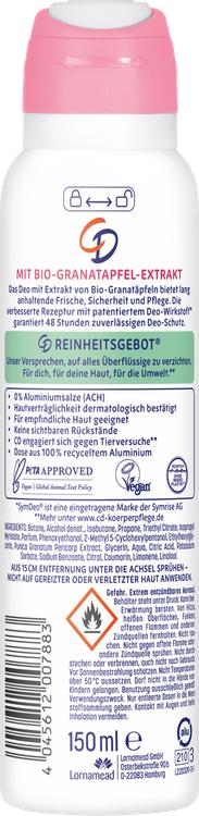 CD Deodorant Spray Organic Pomegranate kombinerer den forfriskende duft og de nærende egenskaber fra økologiske granatæbler fra kontrolleret økologisk dyrkning. Med sin forbedrede formel giver den langvarig friskhed og pålidelig beskyttelse i 24 timer. Takket være den patenterede aktive ingrediens SymDeo® kan du nyde en sikker følelse uden aluminiumssalte. Deosprayen indeholder kun udvalgte ingredienser, der er skånsomme mod huden og sikrer en behagelig følelse af friskhed. Oplev forskellen med en deodorant, der er både effektiv og plejende.