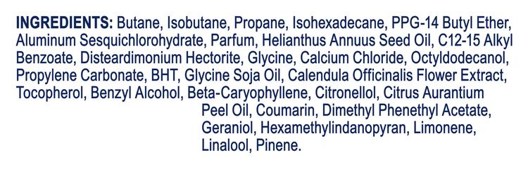 BUTANE, ISOBUTANE, PROPANE, PPG-14 BUTYL ETHER, CYCLOPENTASILOXANE, ALUMINUM SESQUICHLOROHYDRATE, PARFUM, HELIANTHUS ANNUUS SEED OIL, C12-15 ALKYL BENZOATE, DISTEARDIMONIUM HECTORITE, GLYCINE, CALCIUM CHLORIDE, OCTYLDODECANOL, BHT, PROPYLENE CARBONATE, DIMETHICONOL, BENZYL ALCOHOL, CITRONELLOL, COUMARIN, GERANIOL, LIMONENE, LINALOOL.