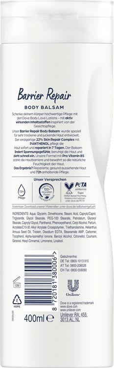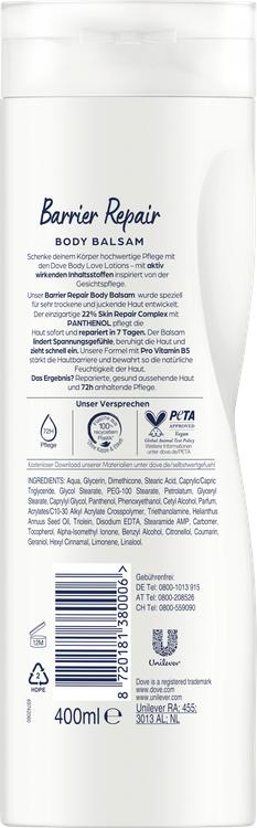 Dove Bodylove Barrier Repair Body Balm er den ideelle løsning til meget tør og kløende hud. Takket være en særlig formel, der indeholder 22% Skin Repair Complex og panthenol, giver denne balm øjeblikkelig pleje og reparerer huden inden for bare 7 dage. Lotionen lindrer følelsen af stramhed, beroliger huden og absorberes hurtigt, så du straks kan nyde en behagelig hudfornemmelse. Med Pro Vitamin B5 styrkes hudbarrieren, så hudens naturlige fugt bevares. Balmen efterlader huden repareret og sundt udseende og giver op til 72 timers langvarig pleje. Den fyldige konsistens er dermatologisk testet og er perfekt til daglig brug. Massér cremen ind i fingerspidserne med cirkulære bevægelser, og oplev en blød, strålende hud. Til ru hudområder giver en ekstra dosis Dove Barrier Repair Body Balm yderligere lindring. Dove er engageret i Body Love og støtter kvinder i at føle sig godt tilpas i deres hud og udvikle deres individuelle skønhed.