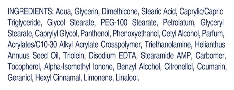 AQUA, GLYCERIN, DIMETHICONE, STEARIC ACID, CAPRYLIC/CAPRIC TRIGLYCERIDE, GLYCOL STEARATE, PEG-100 STEARATE, PETROLATUM, GLYCERYL STEARATE, CAPRYLYL GLYCOL, PANTHENOL, PHENOXYETHANOL, CETYL ALCOHOL, PARFUM, ACRYLATES/C10-30 ALKYL ACRYLATE CROSSLINKER, TRIETHANOLAMINE, HELIANTHUS ANNUUS SEED OIL, TRIOLEIN, DISODIUM EDTA, STEARAMIDE AMP, CARBOMER, TOCOPHEROL, ALPHA-ISOMETHYL IONONE, BENZYL ALCOHOL, CITRONELLOL, COUMARIN, GERANIOL, HEXYL CINNAMAL, LIMONENE, LINALOOL.