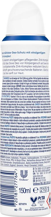 Oplev Dove Deodorant Spray Original, der er specielt udviklet til den sarte hud under armene. Med et nærende zinkkompleks og 0 % aluminiumssalte giver denne deospray pålidelig beskyttelse mod kropslugt i op til 72 timer. Den unikke formel indeholder 1/4 nærende creme, som er skånsom mod huden og efterlader den glat og smidig. Det antibakterielle zinkkompleks virker på to måder: Det reducerer ubehagelige lugte og bekæmper samtidig lugtfremkaldende bakterier. Den subtile duft sikrer en frisk og ren følelse hele dagen. For at opnå det bedste resultat skal deodoranten påføres på tør, afkølet hud ved at holde sprayen lodret foran armhulerne i en afstand af ca. 15 cm. Dove er stolt af at være PETA-vegan-godkendt og tester ikke på dyr i hele verden, heller ikke i regioner, hvor dyreforsøg er påkrævet.