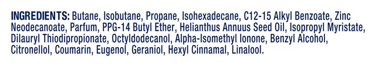 BUTANE, ISOBUTANE, PROPANE, ISOHEXACADECANE, C12-15 ALKYL BENZOATE, ZINC NEODECANOATE, PARFUM, PPG-14 BUTYL ETHER, HELIANTHUS ANNUUS SEED OIL, ISOPROPYL MYRISTATE, DILAURYL THIODIPROPIONATE, OCTYLDODECANOL, ALPHA-ISOMETHYL IONONE, BENZYL ALCOHOL, CITRONELLOL, COUMARIN, EUGENOL, GERANIOL, HEXYL CINNAMAL, LINALOOL.