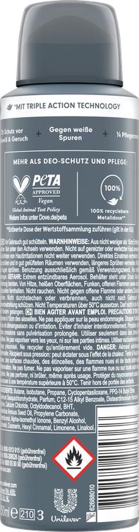 Dove Men+Care Antiperspirant Deodorant Spray Advanced Invisible Dry giver mænd effektiv beskyttelse mod sved og kropslugt i op til 72 timer. Takket være den innovative Triple Action Technology bekæmper den pålideligt ubehagelige lugte, samtidig med at huden føles blød. Formlen indeholder ¼ plejecreme, som er specielt udviklet til følsom hud under armene og forhindrer hudirritation. Desuden efterlader sprayen ingen synlige hvide mærker på tøjet, så du altid kan klæde dig ubekymret på. Med en diskret maskulin duft forkæler deodoranten dig og giver dig en følelse af friskhed og sikkerhed, uanset situationen. Dove Men+Care står for plejeprodukter, der er skræddersyet til mænds behov og sikrer, at mænd føler sig godt tilpas i deres hud.