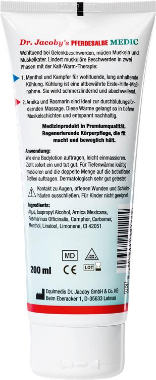 Oplev den regenererende kropspleje fra Dr. Jacoby, som er kendt for sin førsteklasses kvalitet. Original Horse Ointment Medic tilbyder en effektiv kold- og varmebehandling, der specifikt lindrer ryg- og muskelspændinger. Denne specielle salve virker i to faser: Først giver den kølende effekt øjeblikkelig lindring, efterfulgt af en varmende effekt, der fremmer blodcirkulationen og får musklerne til at slappe af. Den er ideel til at lindre ledsmerter, trætte muskler og ømme muskler og holder dig i form og smidig. Forkæl dig selv med denne beroligende pleje, og mærk forskellen!