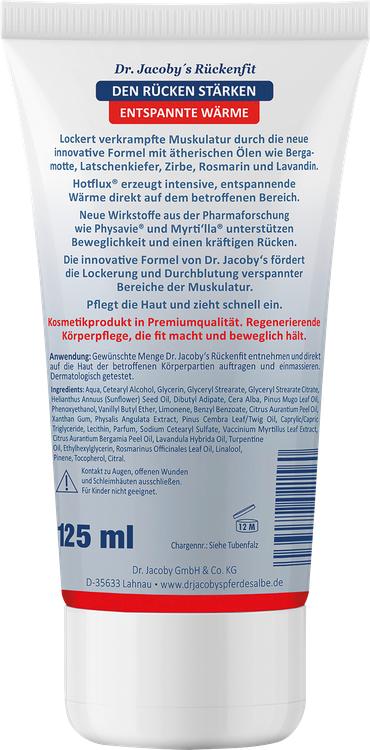 Oplev den innovative Dr. Jacoby's Rückenfit hestesalve, der er specielt udviklet til at løsne anspændte muskler og give afslapning. Den unikke formel indeholder et omhyggeligt udvalg af æteriske olier, bl.a. bergamot, bjergfyr, rosmarin og lavandin, som tilsammen skaber en intens og beroligende varme. Takket være den særlige Hotflux®-teknologi stimuleres blodcirkulationen i de berørte områder, mens de nye aktive ingredienser Physavie® og Myrti'lla® understøtter mobiliteten og fremmer en stærk ryg. Ikke alene plejes huden, men salven absorberes også hurtigt, så du hurtigt kan få gavn af den behagelige effekt.