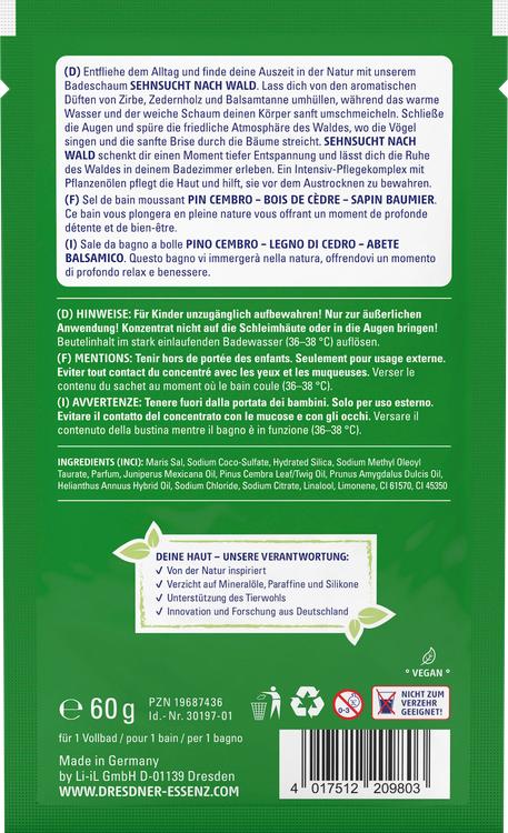 Oplev en afslappende time-out på dit badeværelse med Sehnsucht nach Wald-badeskummet fra Dresdner Essenz. Denne badeskum er inspireret af naturen og kombinerer de beroligende aromaer af schweizisk fyrretræ, cedertræ og balsamgran for at transportere dig til skovens rolige skønhed. Beriget med et særligt intensivt plejekompleks af planteolier af høj kvalitet giver badeskummet ikke kun et luksuriøst skum, der blidt omslutter din krop, men beskytter også din hud mod udtørring. Sig farvel til mineralske olier, kerosener og silikoner - med Dresdner Essenz vælger du et produkt, der respekterer både din hud og dyrevelfærd. Forkæl dig selv, og forvandl dit badeværelse til en ægte oase af velvære.
