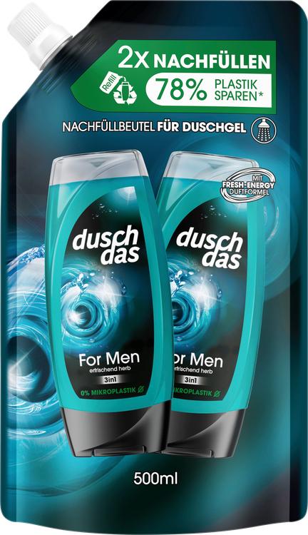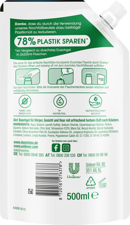 Oplev Duschdas Shower Gel For Men i en praktisk refill-pose. Denne innovative 3-i-1 shower gel & shampoo er den perfekte forfriskning til den moderne mand og giver en revitaliserende bruseoplevelse til krop, hår og ansigt. Med sin karakteristiske syrlige citrusduft giver den en dynamisk start på dagen og holder dig frisk i op til 12 timer. Genopfyldningsposen på 500 ml gør det nemt at genopfylde din shower gel-flaske og hjælper med at reducere plastaffald ved at spare 70 % mindre plast sammenlignet med traditionel emballage. Den hudvenlige, pH-neutrale formel er dermatologisk testet, hvilket gør den ideel til daglig brug. Forkæl dig selv med en frisk og ren hudfølelse med Duschdas, og oplev kombinationen af kvalitet og bæredygtighed.