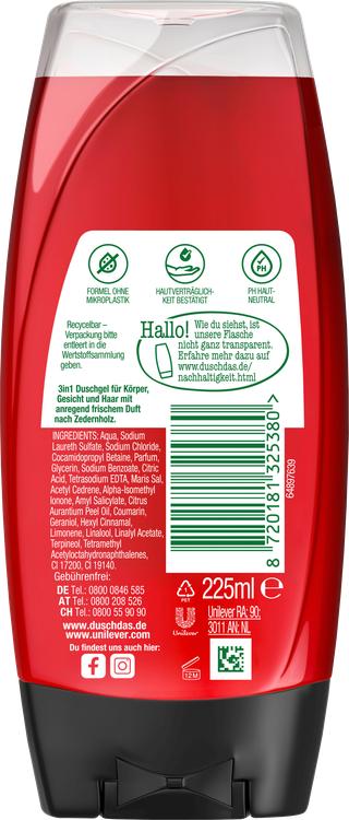 Få en aktiv og vital start på dagen med Duschdas Shower Gel Men 3in1 Noire. Dette innovative produkt kombinerer shower gel og shampoo i ét og er velegnet til krop, ansigt og hår. Fresh Energy-duftformlen giver en stimulerende, krydret duft, der giver en følelse af ren vitalitet og giver dig den energi, du har brug for til en begivenhedsrig dag. Brusegelen er nem at dosere, skummer hurtigt op og efterlader huden frisk og ren. Den er dermatologisk testet og pH-neutral, så den er skånsom mod huden og velegnet til daglig brug. Takket være den praktiske 225 ml-flaske af 100 % genbrugsplast er produktet ikke kun miljøvenligt, men også stabilt og nemt at bruge. Duschdas Shower Gel Men Noire giver dig en forfriskende bruseoplevelse ned til sidste dråbe og støtter dig med en formel, der er 99 % biologisk nedbrydelig og ikke indeholder mikroplast.
