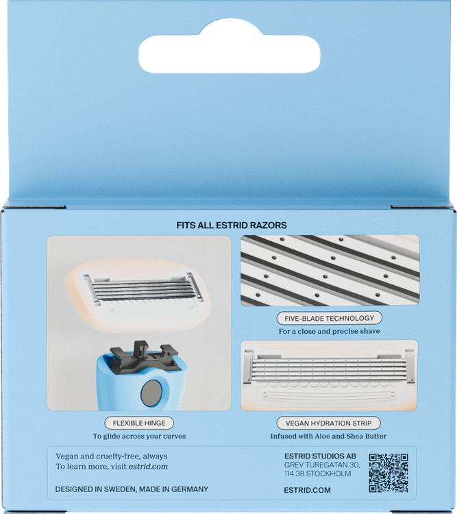 Estrid barberbladsrefill XL giver dig en optimal løsning til en tæt og skånsom barbering. Udstyret med en avanceret 5-bladsteknologi sikrer disse blade et jævnt glid over huden og et usædvanligt glat resultat. Denne refill-pakke indeholder i alt 8 barberhoveder, som er specielt udviklet til at opfylde hele kroppens behov. Bladene er kompatible med alle Estrid-skraberhåndtag, hvilket giver dig fleksibilitet og brugervenlighed. En vegansk fugtgivende strip med sheasmør og aloe vera reducerer hudirritation og fugter, så din hud er optimalt beskyttet under barberingen. Forkæl dig selv med en behagelig og skånsom barberingsoplevelse med Estrid-barberblade.