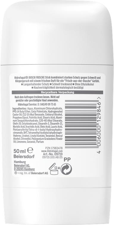 Oplev en forfriskende følelse af friskhed med Hidrofugal Shower Freshness Anti-Perspirant Stick. Denne innovative formel giver pålidelig beskyttelse mod fugt under armene og ubehagelige lugte, samtidig med at den forkæler dig med en forfriskende duft. Deostick'en giver en langvarig følelse af at være nybadet, som varer hele dagen. Takket være den særlige formel uden ethylalkohol er sticken særligt skånsom mod huden og ideel til daglig brug. Denne dermatologisk testede deostick er nem at bruge og giver dig en følelse af renhed og friskhed, samtidig med at den holder din hud behageligt tør. Brug den ikke på irriteret eller beskadiget hud, og lad den virke kortvarigt efter påføring for at opnå det bedste resultat.