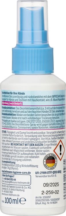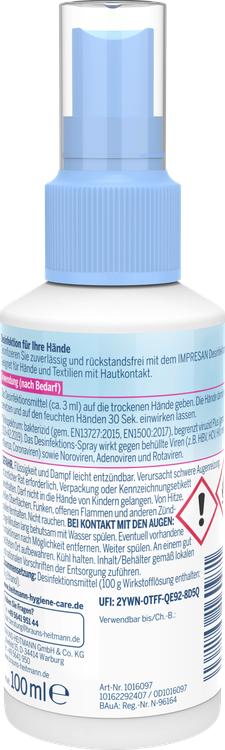 Beskyt dig selv og din familie mod sygdomsfremkaldende bakterier når som helst og hvor som helst med den praktiske Impresan hånddesinfektionsspray. Dette effektive desinfektionsmiddel sikrer hygiejnisk rene hænder uden behov for vand. Den er ideel til brug i hjemmet, på farten eller på rejser og tilbyder en ukompliceret løsning til din håndhygiejne. Sprayen er også ideel til at desinficere ansigtsmasker, så du kan være sikker i enhver situation. Produktet er fri for parfumeolie og er kendetegnet ved sin begrænsede virucidale effekt. Desuden er mindst 70 % af emballagen fremstillet af genbrugsmateriale, hvilket gør den miljøvenlig.