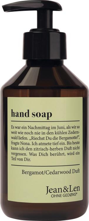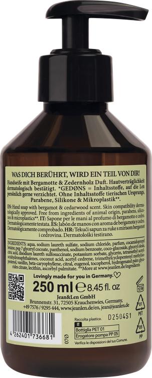 Jean&Len flydende sæbe med den forførende duft af bergamot og cedertræ forvandler håndvask til en beroligende oplevelse. Denne håndsæbe af høj kvalitet indeholder nærende panthenol og fugtgivende ingredienser, der beskytter og skånsomt forkæler huden under vask. Det behageligt lette skum sikrer, at hænderne renses grundigt uden at udtørre dem. Takket være den praktiske emballage med pumpedispenser er sæben ikke kun ideel til daglig brug, men kan også bruges som en forfriskende shower gel. Den flydende sæbe fås også i et miljøvenligt format, der er ideelt til genopfyldning og derfor bidrager til bæredygtighed. Uanset om det er til personlig brug eller som en betænksom gave, er Jean&Len flydende sæbe et fremragende valg til alle, der værdsætter pleje og forkælelse.