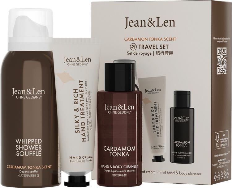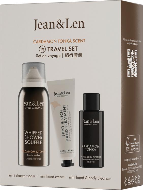 Jean&Len Travel Set Cardamom/Tonka er det ideelle ledsagersæt til rejsende og duftelskere. Med sit perfekt koordinerede udvalg af tre miniprodukter af høj kvalitet - en håndcreme, en bruseskum og en hånd- og kropssæbe - tilbyder dette sæt alt, hvad du har brug for til pleje på farten. Den let krydrede duft af kardemomme og tonka udfolder sig under brug og giver et strejf af orientalsk varme til huden. De praktiske rejsestørrelser er ideelle til håndbagagen og sikrer, at du ikke behøver at undvære velplejede hænder og forfriskende rensning, når du er på farten. Uanset om det er en lille gave til en, du holder af, eller en forkælende stund for dig selv, er dette sæt et vidunderligt valg til enhver lejlighed. Emballagen er FSC-certificeret, og sættet er produceret i Tyskland, hvilket understreger Jean&Lens bæredygtige filosofi.