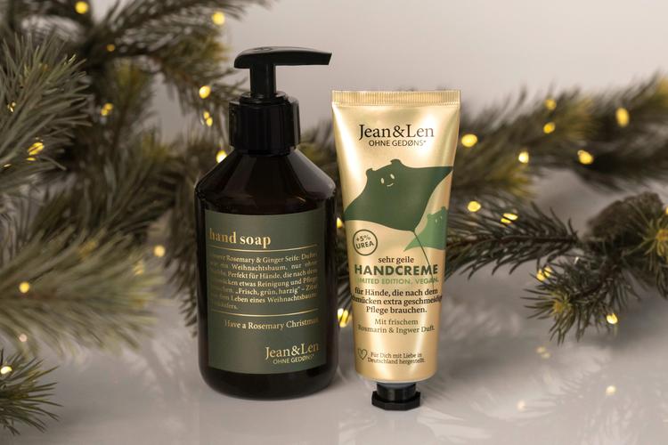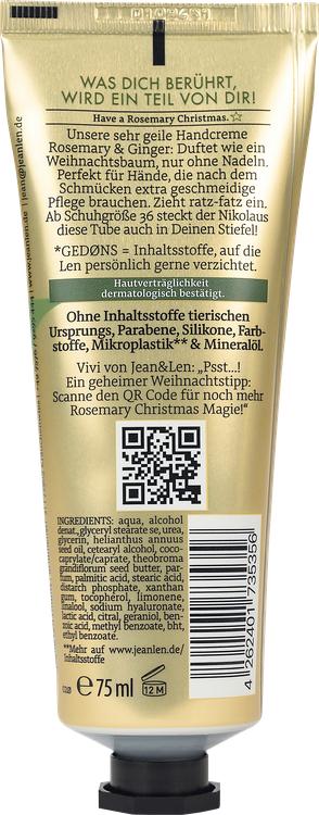 Jean&Len håndcreme med den beroligende duft af rosmarin og ingefær er den ideelle pleje til tørre og stressede hænder. Beriget med 5 % urea og hyaluronsyre sørger den for, at dine hænder bliver intensivt fugtet og føles smidige og glatte. Den særlige formel indeholder også værdifuldt cupuacusmør og E-vitamin, som nærer huden og får den til at føles velplejet. Håndcremen absorberes hurtigt og efterlader ikke en fedtet film, så du kan bruge dine hænder igen med det samme. Fri for silikoner, parabener og mikroplast er dette produkt et miljøbevidst valg og ideelt til alle, der sætter pris på vegansk kosmetik.