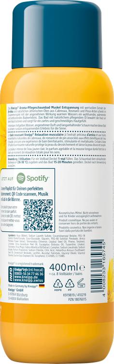 Oplev en beroligende badeoplevelse, der bringer krop og sind i harmoni med Kneipp® Aroma Care Foam Bath Muscle Relaxation. Den særlige formel kombinerer det værdifulde ekstrakt af arnica med naturlige æteriske olier fra cabreuva, rosmarin og forskellige Pinus-arter. I kombination med varmt vand skaber det en behagelig, varmende fornemmelse, der lindrer spændinger og bidrager til afslapning. Badet forhindrer huden i at tørre ud og efterlader den blød og smidig. Nyd den intense, lysegule farve og det langvarige skum, der forkæler dine sanser. Den dermatologisk bekræftede kompatibilitet og milde rensning gør dette produkt til et ideelt valg til dine afslapningsritualer. Formlen er også vegansk og fri for mikroplast, petroleum, silikone og mineralske olier.