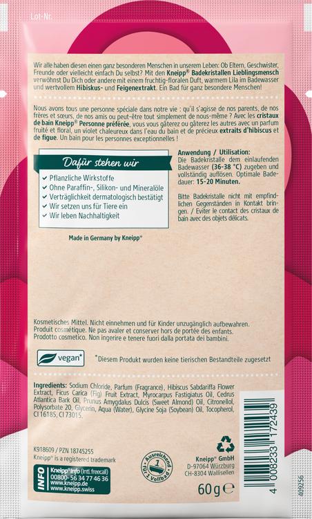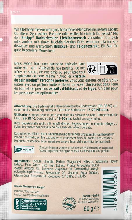 Forkæl dig selv eller dine kære med en unik badeoplevelse med Kneipp® Lieblingsmensch badekrystaller. Kombinationen af dyrebar hibiscus og figenekstrakt skaber en frugtagtig blomsterduft, der bader vandet i en varm lilla farve og skaber en afslappende atmosfære. Uanset om det er en kærlig gave til forældre, søskende eller en bedste ven - disse badekrystaller er det perfekte valg til at give en gave i form af øjeblikke med afslapning og velvære. De er også ideelle til at gøre noget godt for dig selv og forvandle dit badekar til en personlig oase af velvære. Nyd den behagelige farve i vandet og de beroligende egenskaber i de omhyggeligt udvalgte ingredienser til en beroligende badeoplevelse.