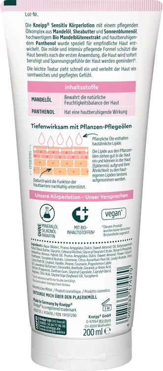Kneipp Sensitive Body Lotion med økologisk mandelblomst er specielt udviklet til at opfylde behovene hos følsom hud og giver dyb effektiv pleje. Dens særlige formel indeholder et nærende oliekompleks af mandelolie, sheasmør og solsikkeolie, suppleret med mandelblomstekstrakt af høj kvalitet og hudberoligende panthenol. Efter påføring beroliges huden straks, og ubehagelige fornemmelser af stramhed reduceres mærkbart. Lotionens lette konsistens absorberes hurtigt og efterlader huden fløjlsblød og velplejet. Takket være de plantebaserede plejeolier understøttes den naturlige hudbarriere, og huden får den fugt, den har brug for, for at se sund og strålende ud.