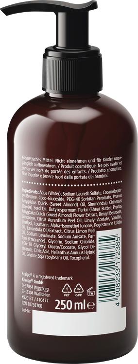 AQUA (WATER), SODIUM LAURETH SULFATE, COCAMIDOPROPYL BETAINE, COCO-GLUCOSIDE, PEG-40 SORBITAN PEROLEATE, PRUNUS AMYGDALUS DULCIS (SWEET ALMOND) OIL, SIMMONDSIA CHINENSIS (JOJOBA) SEED OIL, BUTYROSPERMUM PARKII (SHEA) BUTTER, PRUNUS AMYGDALUS DULCIS (SWEET ALMOND) FLOWER EXTRACT, AMYRIS BALSAMIFERA BARK OIL, POGOSTEMON CABLIN LEAF OIL, BENZYL BENZOATE, LIMONENE, ALPHA-ISOMETHYL IONONE, LINALOOL, COUMARIN, BENZYL ALCOHOL, SODIUM LEVULINATE, SODIUM ANISATE, PARFUM (FRAGRANCE), GLYCERIN, SODIUM CHLORIDE, PEG-18 GLYCERYL OLEATE/COCOATE, GLYCOL DISTEARATE, CITRIC ACID, HELIANTHUS ANNUUS HYBRID OIL, GLYCINE SOJA (SOYBEAN) OIL, TOCOPHEROL.