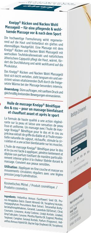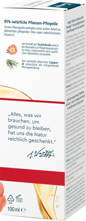 Kneipp Massage Oil Back & Neck Wellbeing er det perfekte valg til en beroligende massage i ryg- og nakkeområdet. Beriget med værdifuldt djævlekloekstrakt og naturlig æterisk cajeputolie har den en afslappende effekt og fremmer blodcirkulationen. Den særlige formulering er ideel til brug før og efter sportslige aktiviteter for at lindre spændinger og få musklerne til at slappe af. Kombinationen af nærende solsikkeolie og fugtregulerende mandelolie giver intensiv pleje til huden, mens cellebeskyttende E-vitamin regenererer og nærer huden. En massage med denne olie efterlader huden glat, og den revitaliserende duft frigives gennem massagens varme. Denne massageolie anbefales af fysioterapeuter og er en uundværlig ledsager til dit velbefindende.