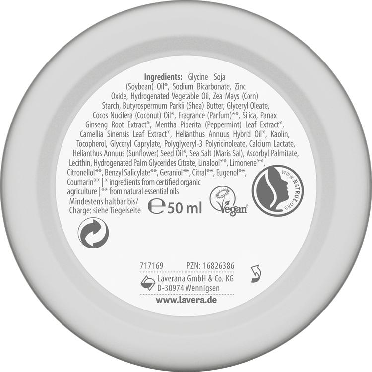 GLYCINE SOJA (SOYBEAN) OIL*, SODIUM BICARBONATE, ZINC OXIDE, HYDROGENATED VEGETABLE OIL, ZEA MAYS (CORN) STARCH, BUTYROSPERMUM PARKII (SHEA) BUTTER, GLYCERYL OLEATE, COCOS NUCIFERA (COCONUT) OIL*, FRAGRANCE (PARFUM)**, SILICA, PANAX GINSENG ROOT EXTRACT*, MENTHA PIPERITA (PEPPERMINT) LEAF EXTRACT*, CAMELLIA SINENSIS LEAF EXTRACT*, HELIANTHUS ANNUUS HYBRID OIL*, KAOLIN, TOCOPHEROL, GLYCERYL CAPRYLATE, POLYGLYCERYL-3 POLYRICINOLEATE, CALCIUM LACTATE, HELIANTHUS ANNUUS (SUNFLOWER) SEED OIL*, SEA SALT (MARIS SAL), ASCORBYL PALMITATE, LECITHIN, HYDROGENATED PALM GLYCERIDES CITRATE, LINALOOL**, LIMONENE**, CITRONELLOL**, BENZYL SALICYLATE**, GERANIOL**, CITRAL**, EUGENOL**, COUMARIN**