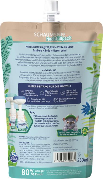 Mabyen Kids skumsæbe i det populære Paw Patrol-design er det perfekte valg til skånsom rengøring af børns sarte hænder. Denne bløde, blå skumsæbe er særlig mild og pH-neutral, hvilket gør den ideel til hyppig håndvask. Med sin behagelige duft af blåbær giver den en beroligende oplevelse, når man vasker. Skumsæben er dermatologisk testet for hudkompatibilitet og er derfor også ideel til følsom hud. Takket være den praktiske refill-pakke er den et miljøvenligt alternativ, som opmuntrer børn til at vaske hænder regelmæssigt.
