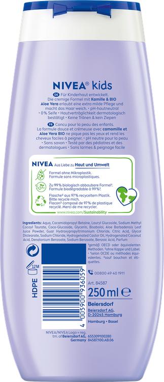 Nivea Kids 3in1 shower gel, shampoo og balsam kombinerer skånsom rensning med behagelig pleje til børns følsomme hud og fine hår. Den særlige, pH-neutrale formel er sæbefri og sikrer, at der ikke dannes tårer under vask. Beriget med økologisk aloe vera og kamille plejer dette produkt huden og gør håret silkeblødt. Den medfølgende balsam gør kæmningen lettere og forhindrer træk. Desuden er formlen 99 % biologisk nedbrydelig og indeholder ikke mikroplast, hvilket ikke kun er godt for dine børns hud, men også for miljøet. Emballagen er lavet af 97% genbrugsmateriale. Nyd den fortryllende bærduft, der gør brusebadet til en dejlig oplevelse.