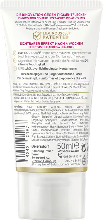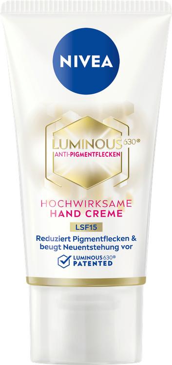 Oplev Nivea LUMINOUS630 håndcreme, en banebrydende innovation i kampen mod pigmentpletter. Efter over et årti med intensiv forskning og analyse af mere end 50.000 ingredienser har Nivea udviklet en unik aktiv ingrediens, der effektivt reducerer eksisterende pigmentpletter og samtidig forhindrer dannelsen af nye. Den ikke-fedtende formel er velegnet til daglig brug og viser synlige resultater efter kun 4 uger. Med solbeskyttelsesfaktor 15 giver håndcremen ekstra beskyttelse mod lysinduceret aldring af huden. Beriget med hyaluronsyre giver den huden intensiv fugt i 24 timer, hvilket sikrer mere jævne og yngre udseende hænder. Hudkompatibiliteten er dermatologisk bekræftet, så du kan bruge håndcremen uden at tøve.
