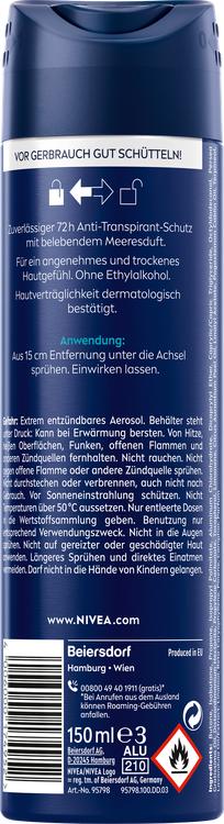 Oplev Nivea Men Cool Marine antiperspirant deodorantspray, som giver dig 72 timers langvarig beskyttelse mod sved og ubehagelig lugt. Den særlige formel uden ethylalkohol virker effektivt mod lugtfremkaldende bakterier og giver samtidig behagelig pleje til din hud. Den forfriskende marine duft opfrisker dine sanser og gør denne deospray til den ideelle tilføjelse til din daglige hudplejerutine. Den dermatologisk testede hudkompatibilitet garanterer skånsom påføring uden hudirritation, så du kan føle dig frisk og veltilpas hele dagen.