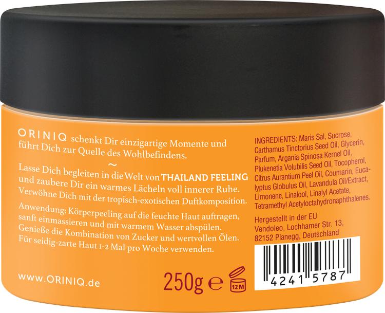 Oplev Oriniq Thailand Feeling body scrub, en luksuriøs sukker- og olieskrub, der forkæler din hud med værdifulde ingredienser. Kombinationen af arganolie og sacha inchi-olie giver intensiv pleje og efterlader din hud smidig. Denne veganske scrub indeholder ingen mikroplast eller vandopløselige, rent syntetiske polymerer. Lad dig rive med af den eksotiske duftsammensætning, som begynder med friske noter af bergamot, appelsin og grøn eukalyptus. Krydrede elementer og urtearomaer fra en bambuslund kombineres og omsluttes af delikat appelsinblomst. Forkæl dig selv med et stykke Thailand, og oplev ren afslapning.