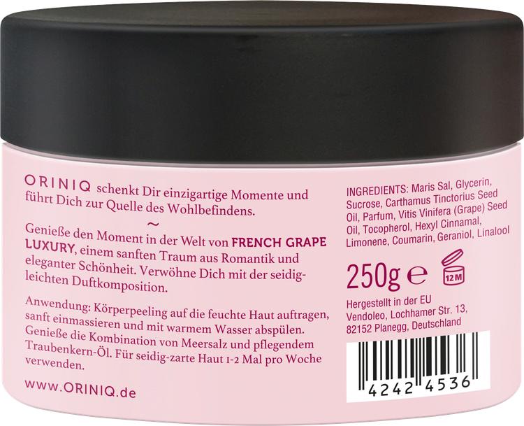 Oplev den luksuriøse Oriniq French Grape Luxury cream-oil scrub, et unikt hudplejeprodukt, der forkæler din hud med en kombination af druekerneolie af høj kvalitet og revitaliserende havsalt. Denne veganske scrub er fremstillet uden mikroplast og vandopløselige, rent syntetiske polymerer, så du behøver ikke at bekymre dig om skadelige ingredienser, når du eksfolierer din hud. Creme-olieskrubben sikrer ikke kun en grundig rensning, men giver også en uimodståelig duftoplevelse, der minder om romantiske franske øjeblikke. Forkæl dig selv og din hud med denne eksklusive pleje, der efterlader den blød, smidig og revitaliseret.