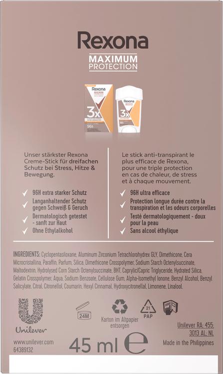 Rexona Maximum Protection Deodorant Cream Sports Control giver pålidelig beskyttelse mod overdreven sved og sikrer en frisk følelse, uanset om det er under sport eller i hverdagen. Den særlige formel beskytter mod sved og ubehagelig lugt i op til 96 timer, selv under stress, varme eller træning. Denne deodorantcreme er dermatologisk testet og er særlig skånsom mod huden, hvilket gør den velegnet til følsom hud. Anvendelsen er enkel: Drej cremestangen i bunden, indtil du hører to klik, og påfør cremen jævnt på rene og tørre armhuler. For at opnå optimale resultater anbefaler vi, at du anvender deodoranten om aftenen, så den kan udvikle sin fulde effekt. Rexona har gjort det til sin mission at udvikle innovative produkter, der giver effektiv beskyttelse og pleje af huden på samme tid. Stol på Rexona, uanset om det er til en intensiv træning eller en vigtig aftale.
