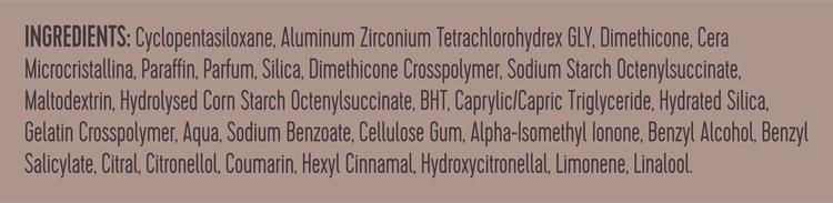 CYCLOPENTASILOXANE, ALUMINUM ZIRCONIUM TETRACHLOROHYDREX GLY, DIMETHICONE, CERA MICROCRISTALLINA, PARAFFIN, PARFUM, SILICA, DIMETHICONE CROSPOLYMER, SODIUM STARCH OCTENYLSUCCINATE, MALTODEXTRIN, HYDROLYSED CORN STARCH OCTENYLSUCCINATE, BHT, CAPRYLIC/CAPRIC TRIGLYCERIDE, HYDRATED SILICA, GELATIN CROSPOLYMER, AQUA, SODIUM BENZOATE, ALPHA-ISOMETHYL IONONE, BENZYL ALCOHOL, BENZYL SALICYLATE, CITRONELLOL, LIMONENE, LINALOOL.