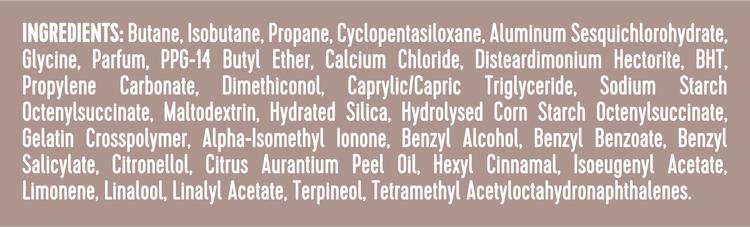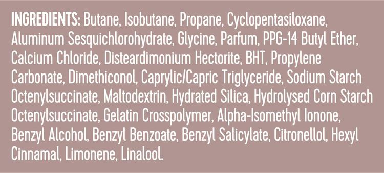 BUTANE, ISOBUTANE, PROPANE, CYCLOPENTASILOXANE, ALUMINUM SESQUICHLOROHYDRATE, GLYCINE, PARFUM, PPG-14 BUTYL ETHER, CALCIUM CHLORIDE, DISTEARDIMONIUM HECTORITE, BHT, PROPYLENE CARBONATE, DIMETHICONOL, CAPRYLIC/CAPRIC TRIGLYCERIDE, SODIUM STARCH OCTENYLSUCCINATE, MALTODEXTRIN, HYDRATED SILICA, HYDROLYSED CORN STARCH OCTENYLSUCCINATE, GELATIN CROSPOLYMER, ALPHA-ISOMETHYL IONONE, BENZYL ALCOHOL, BENZYL BENZOATE, BENZYL SALICYLATE, CITRONELLOL, HEXYL CINNAMAL, LIMONENE, LINALOOL.