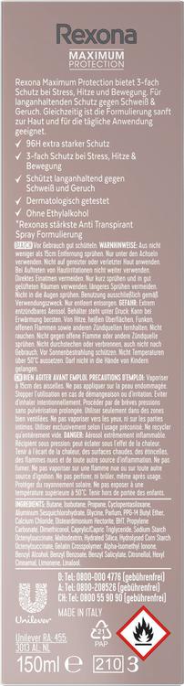 Oplev den ultimative beskyttelse med Rexona Maximum Protection antiperspirant deospray i den friske duftsammensætning af lime og åkande. Denne kraftfulde deospray giver dig op til 96 timers pålidelig beskyttelse mod sved og ubehagelige lugte, uanset om du er under stress, i varmen eller under træning. Den innovative spray kombineres med din huds naturlige fugt og danner en gel, der beskytter svedkirtlerne og sikrer en langvarig følelse af friskhed. Nyd en selvsikker fremtoning hver dag, mens den frugtagtige duft opfrisker dine sanser. Ideel til aktive mennesker, der ønsker pålidelig beskyttelse, selv under fysisk anstrengelse eller i anspændte situationer. Rexona antiperspirant er alkoholfri og hjælper dig med at føle dig godt tilpas hele vejen rundt. Husk at ryste sprayen godt før brug og spray jævnt på armhulerne fra en afstand på 15 cm. Beskyt dig selv effektivt og miljøbevidst - dåsen kan genbruges i det uendelige og er produceret med 100 % grøn elektricitet.